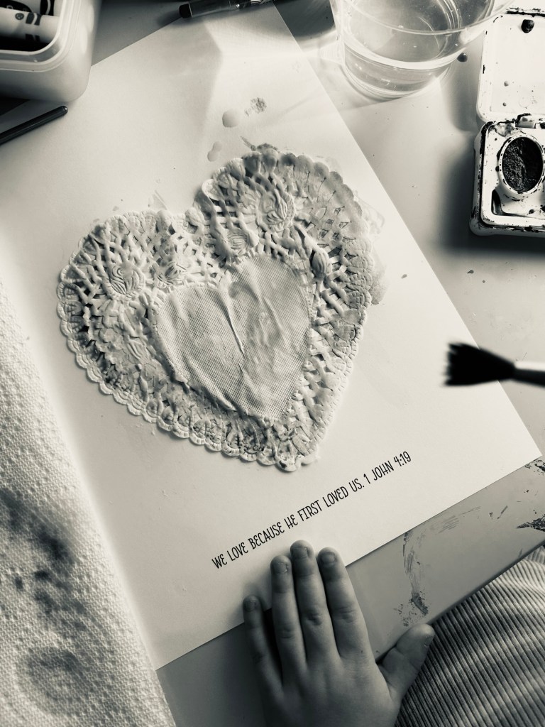 I’ve thought about sharing some of my mama moments and ideas. 🙂 I’m no expert but I want to encourage and give some ideas — crafts, lessons, books. Don’t over complicate things, simple is good. A little valentine craft that I came up with for today. Nothing fancy! Heart shaped doilies I picked up at hobby lobby (but have seen similar items at the dollar tree), white cardstock, and a water color palette! I used a printer to add the verse but can definitely be hand written. It can also be used for discussion about where love comes from — God.